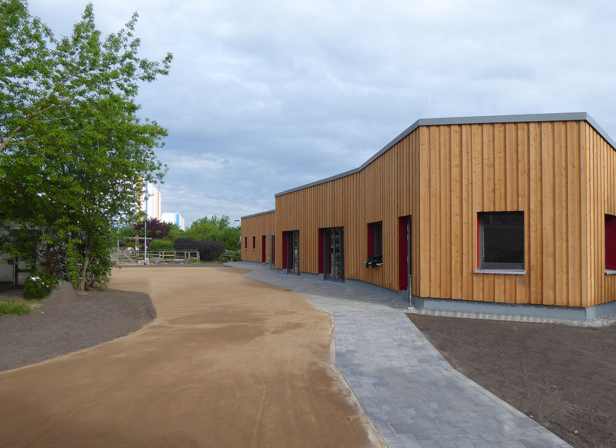 Das bestehende Gebäude wurde durch einen größeren Neubau ersetzt. Im Neubau bieten 2 Gruppenräume mit Küche, Werkstatt, Büro und einem überdachten, von außen zugänglichen Kletterbereich, Platz für die pädagogische Arbeit. Entwickelt wurde ein eingeschossiger Neubau, der sich dem Grundstück und dem in liebevoller Eigenarbeit entstanden Kinderbauernhof im Bestand unterordnet. Das Gebäude erhält eine vorgesetzte Holzverblendung so wird es auch optisch dem ökologisch anmutenden Bauernhof gerecht.
