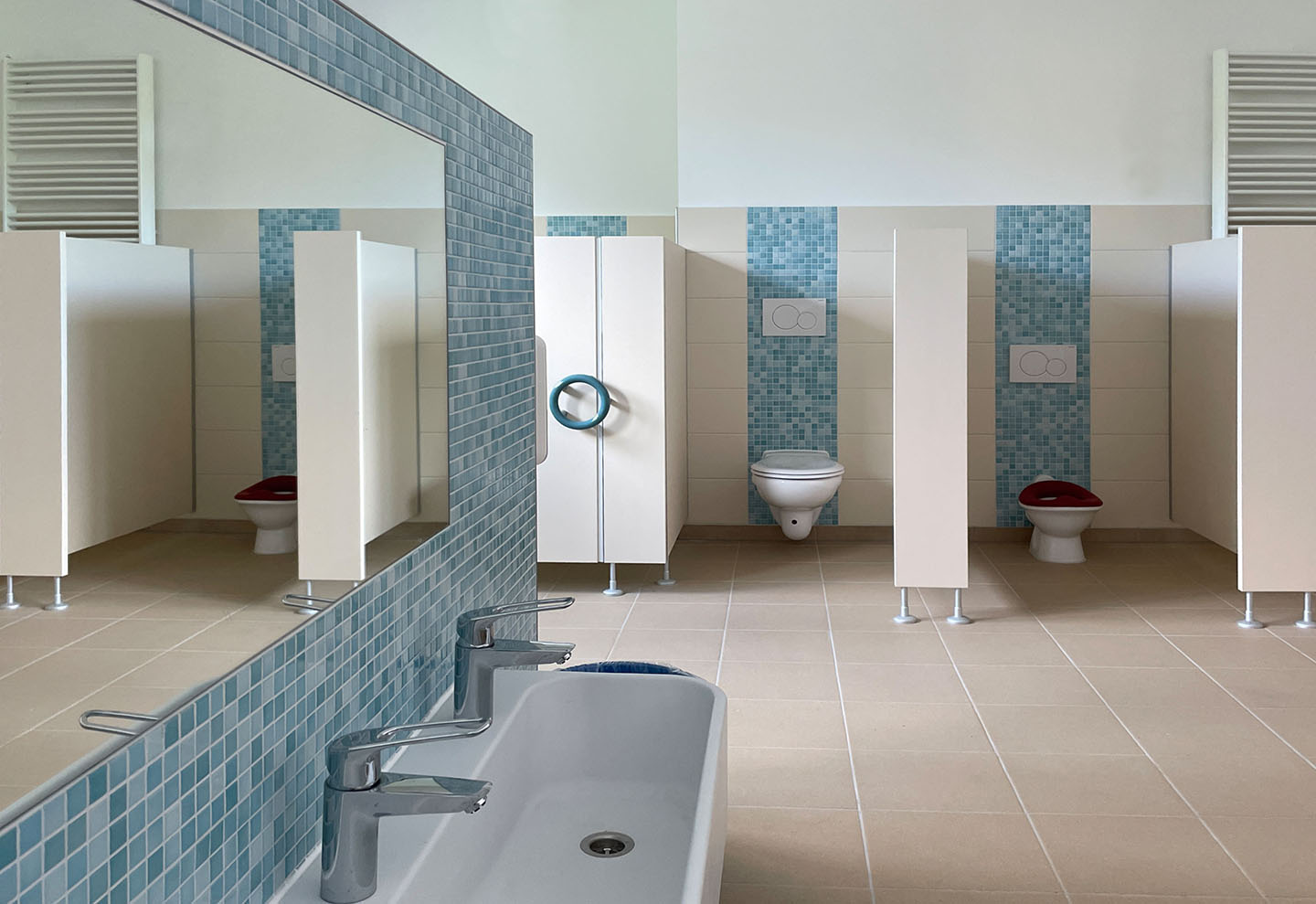 In den oberen Geschossen befinden sich, neben den weiteren Funktionsräumen der Kinder mit zugeordneten Garderoben- und Sanitäreinheiten, auch die Vollküche, die die gesamte Einrichtung mit gesunder Kost versorgt.