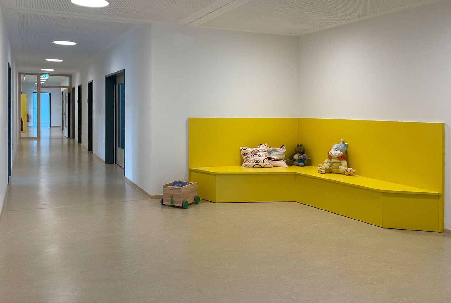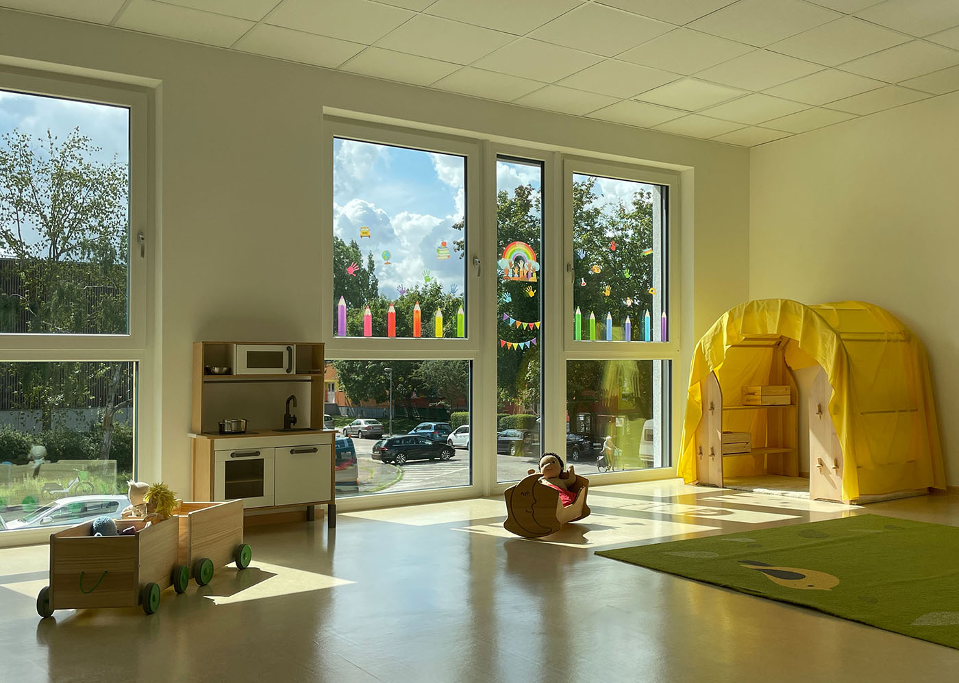 Die beiden Obergeschosse können über zwei Treppenhäuser oder den barrierefreien Aufzug erreicht werden. Im Erdgeschoss befinden sich die Kitaverwaltung, ein großer Sport- und Bewegungsraum und der Nestbereich für die Kleinsten. Dieser verfügt über direkte Ausgänge in den angrenzenden Gartenbereich.