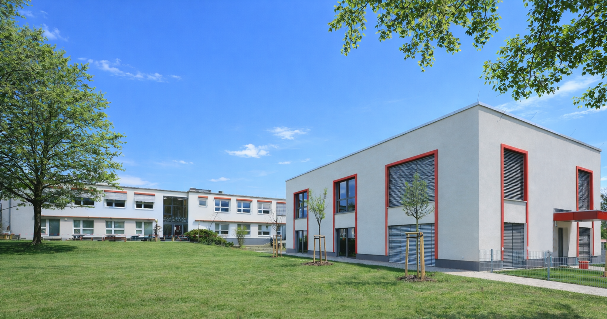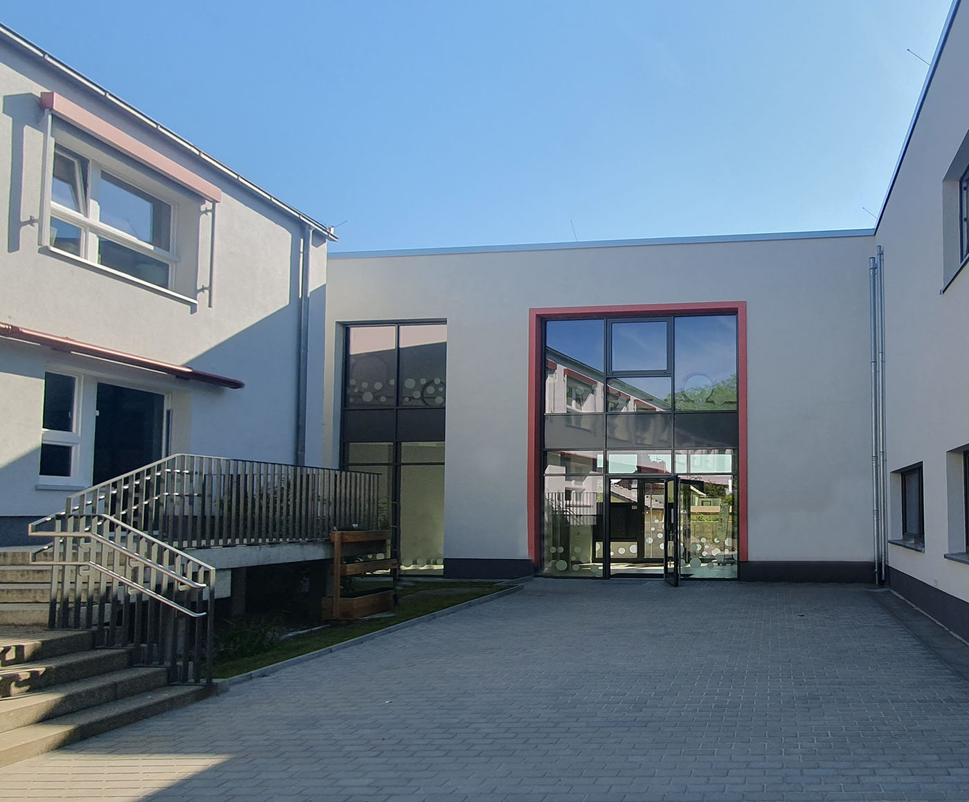 Der als Anbau konzipierte Erweiterungsbau sollte die Möglichkeit bieten, beide Gebäude in allen Geschossen barrierefrei zu erschließen. Als Bindeglied dient ein Treppenhaus mit einem Personenaufzug. Die unterschiedlichen Höhenniveaus beider Gebäudeteile werden mittels einer zusätzlichen Haltestelle und einer geneigten Ebene, die gleichzeitig als Spielrampe dient, ausgeglichen.