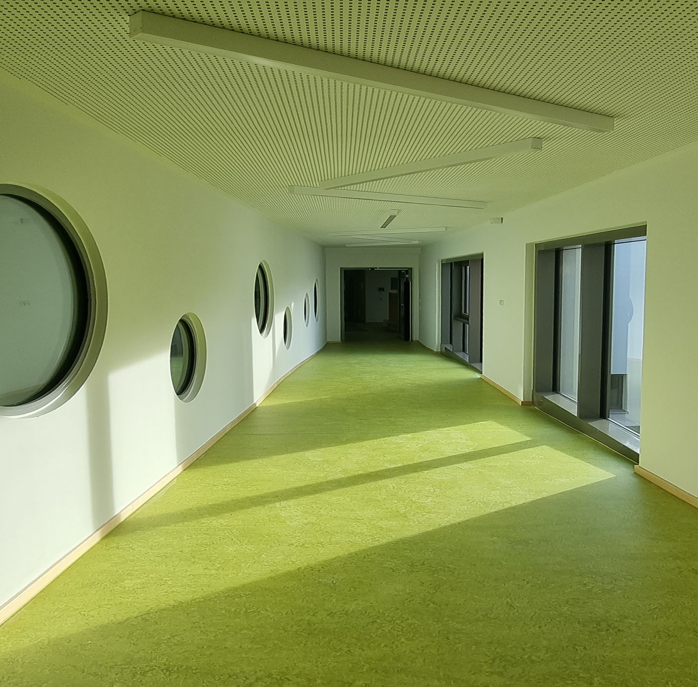 Auf beiden Etagen des Neubaus werden jeweils 30 Kinder in Altersmischung betreut. Die zum Garten orientierten Gruppenräume bieten die Möglichkeit, nicht behinderte und behinderte Kinder gemeinsam zu betreuen. (Integration)