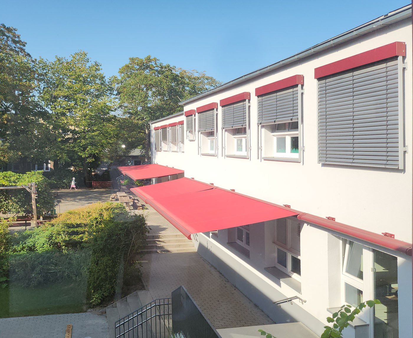 Gartenseitig wurden die Zugänge neu gestaltet. Das Erdgeschoss geht nun über eine vielfach nutzbare Treppenlandschaft in die Außenanlagen der Kindertagesstätte über. Die Südausrichtung der Gartenfassade und der sommerliche Wärmeschutz machten den Einsatz von Sonnenschutzsystemen erforderlich. Als Kontrast zur weißen Fassade wurden rote Sonnenschutzsysteme gewählt. Diese bringen mit dem vielen Grün der Umgebung ein komplementäres Farbspiel.